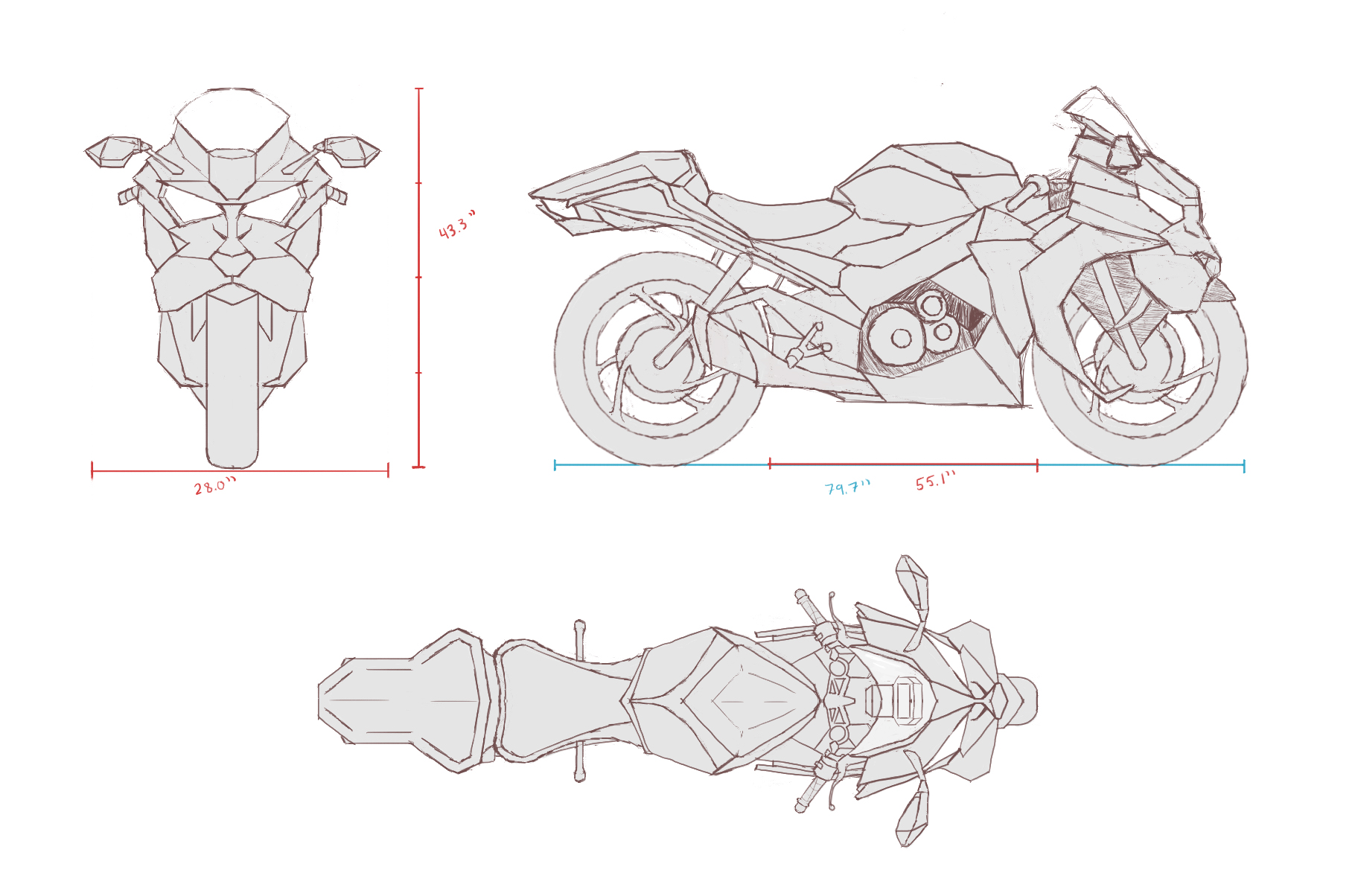 “Cat Bike” is a motorcycle I designed, modeled, textured, and rigged with the purpose of exploring various hard-surface modeling techniques and focusing on precision in modeling, as well as translating 2D designs into 3D objects. The design of the motorcycle is inspired by large cats such as jaguars and panthers and based on several Japanese motorcycles and sports bikes from brands such as Suzuki and Yamaha. The final design, shown below, was achieved after several rounds of ideation and includes all visible features of a functional motorcycle, such as handlebars, foot rests, exhaust pipes, and brakes, to name a few. Additional research was done on the steering mechanisms of motorcycles to allow for more accurate rigging.