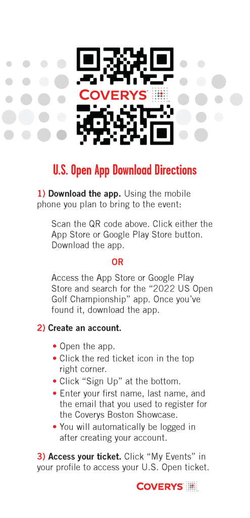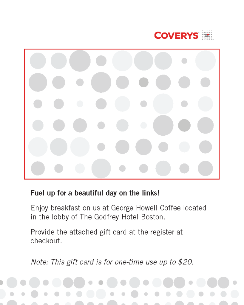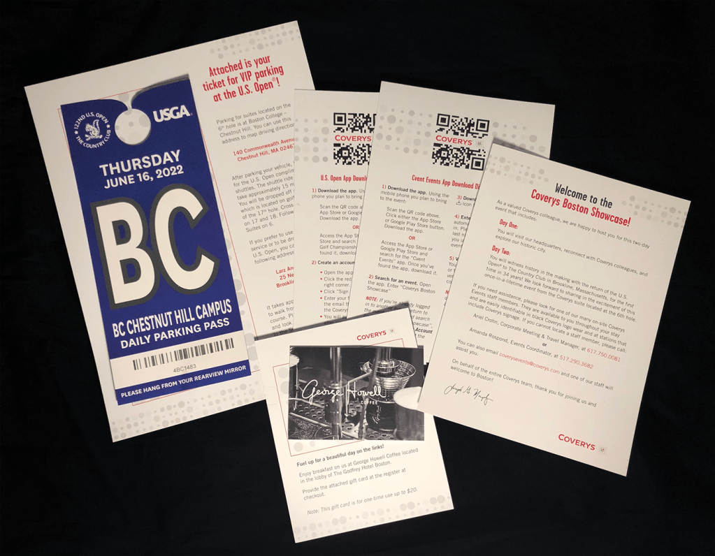 The Coverys Boston Showcase was a weekend-long event for Coverys business development representatives and select agents and brokers. The agenda included dinner outings, tours of Boston, and a seat at a semi-private suite on the course of the U.S. Open Golf Championship. My role was to create branded documents and signage for the event, as well as design the branded décor of the golf course suite. The branding for the entire event was a variation of the company’s general branding, meant to be special to the event while still following the look and feel of Coverys.