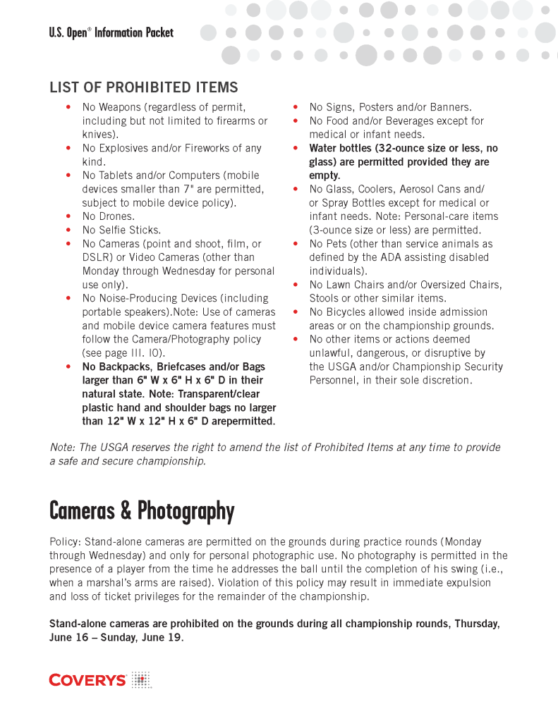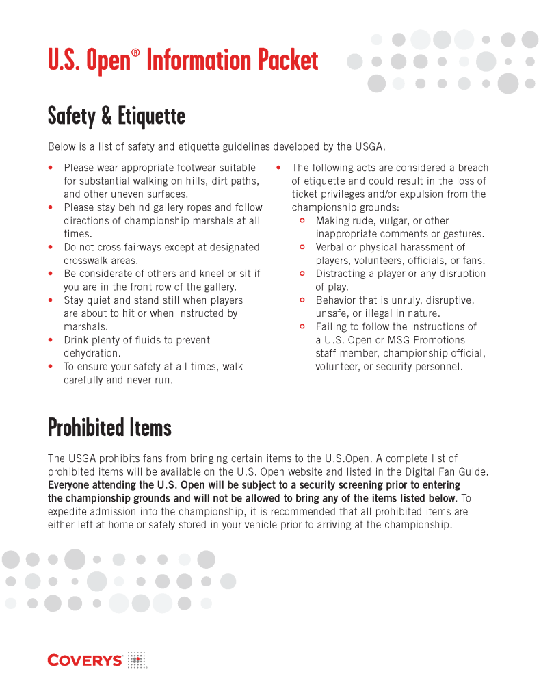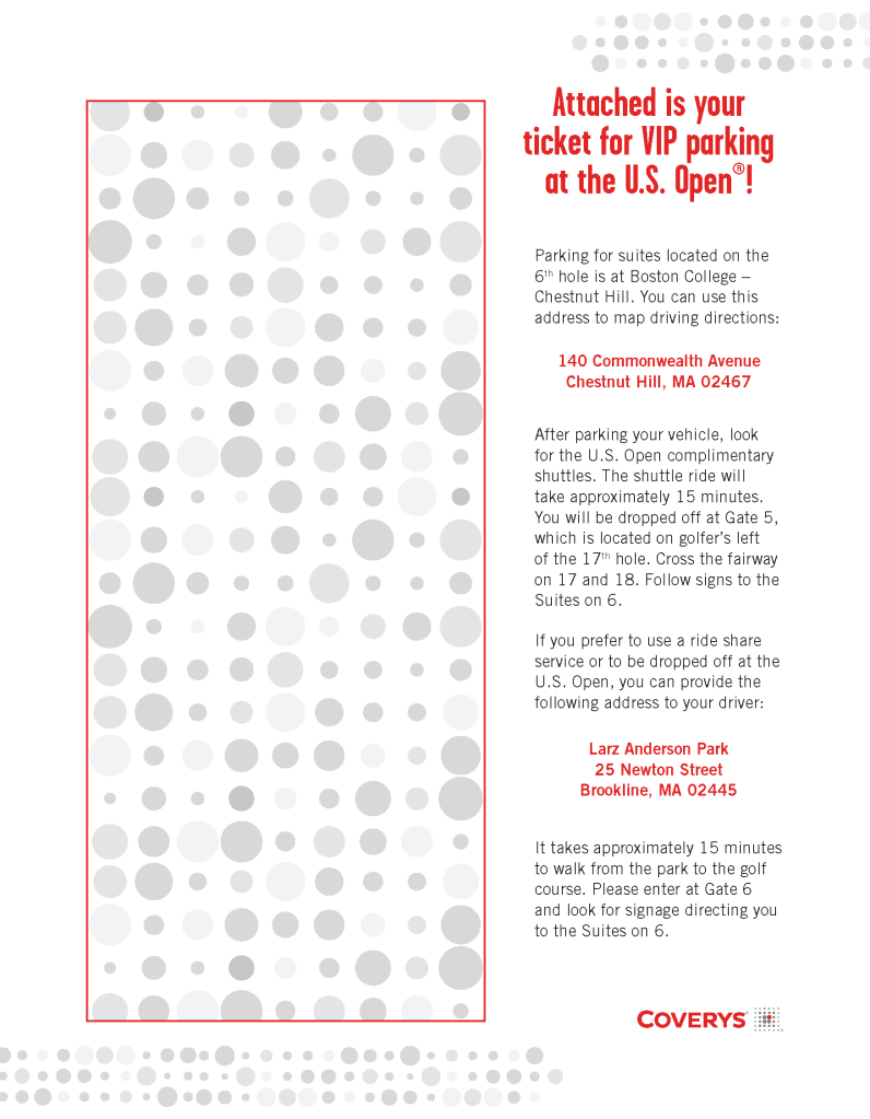 Below are several documents that were included in the welcome basket given to guests staying in the provided accommodations. The documents are (left to right, top to bottom): VIP Parking Pass Instructions, U.S. Open App Download Directions, Cvent Events App Download Directions, Welcome Letter from the CEO, and Coffee Pass Card. The last two documents in the slideshow are two pages taken from the U.S. Open Information Packet given to guests. The 7-page packet outlines the rules of the event, parking instructions, maps, a detailed agenda, and the history and facts of the U.S. Open Championship.