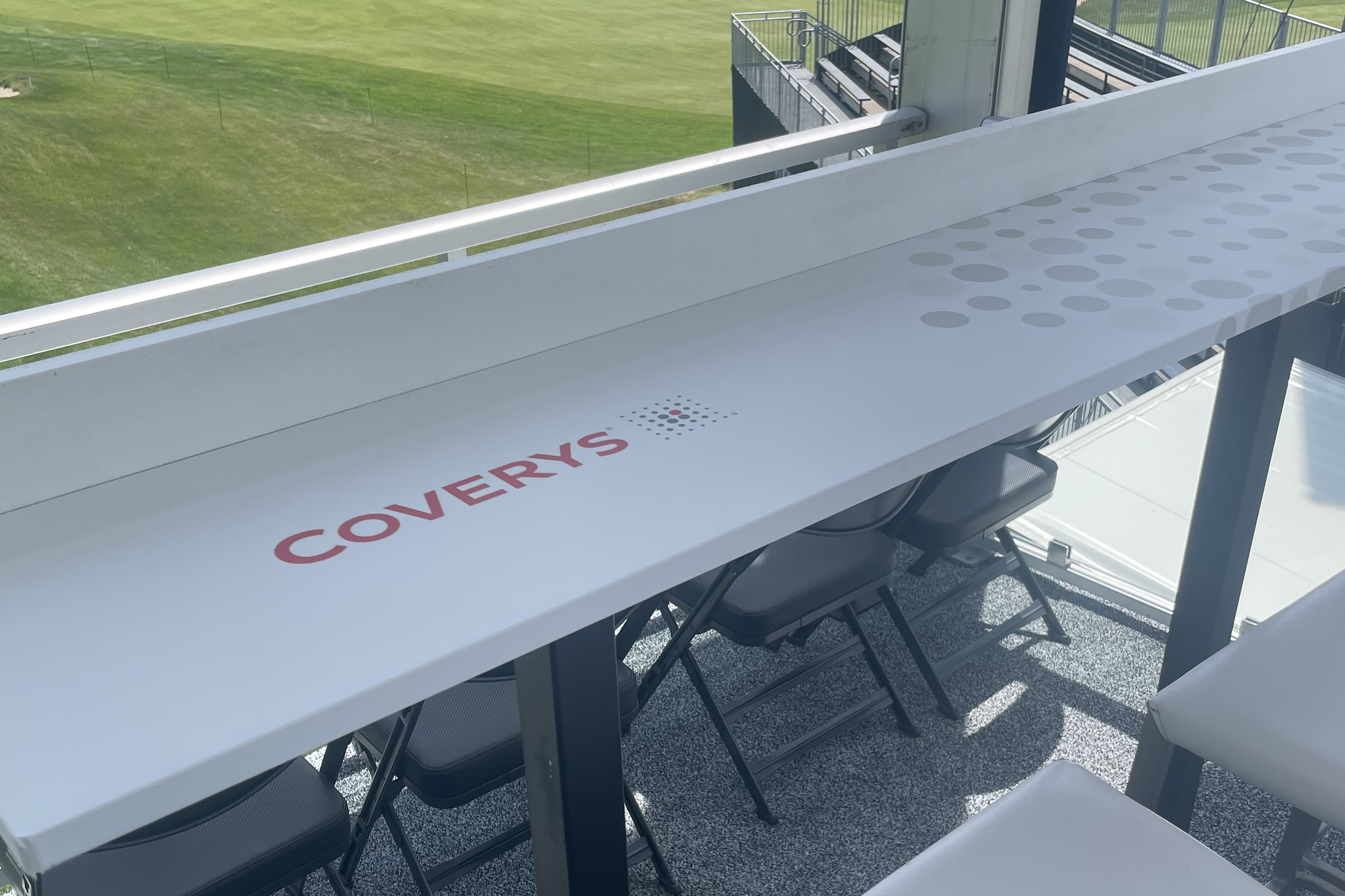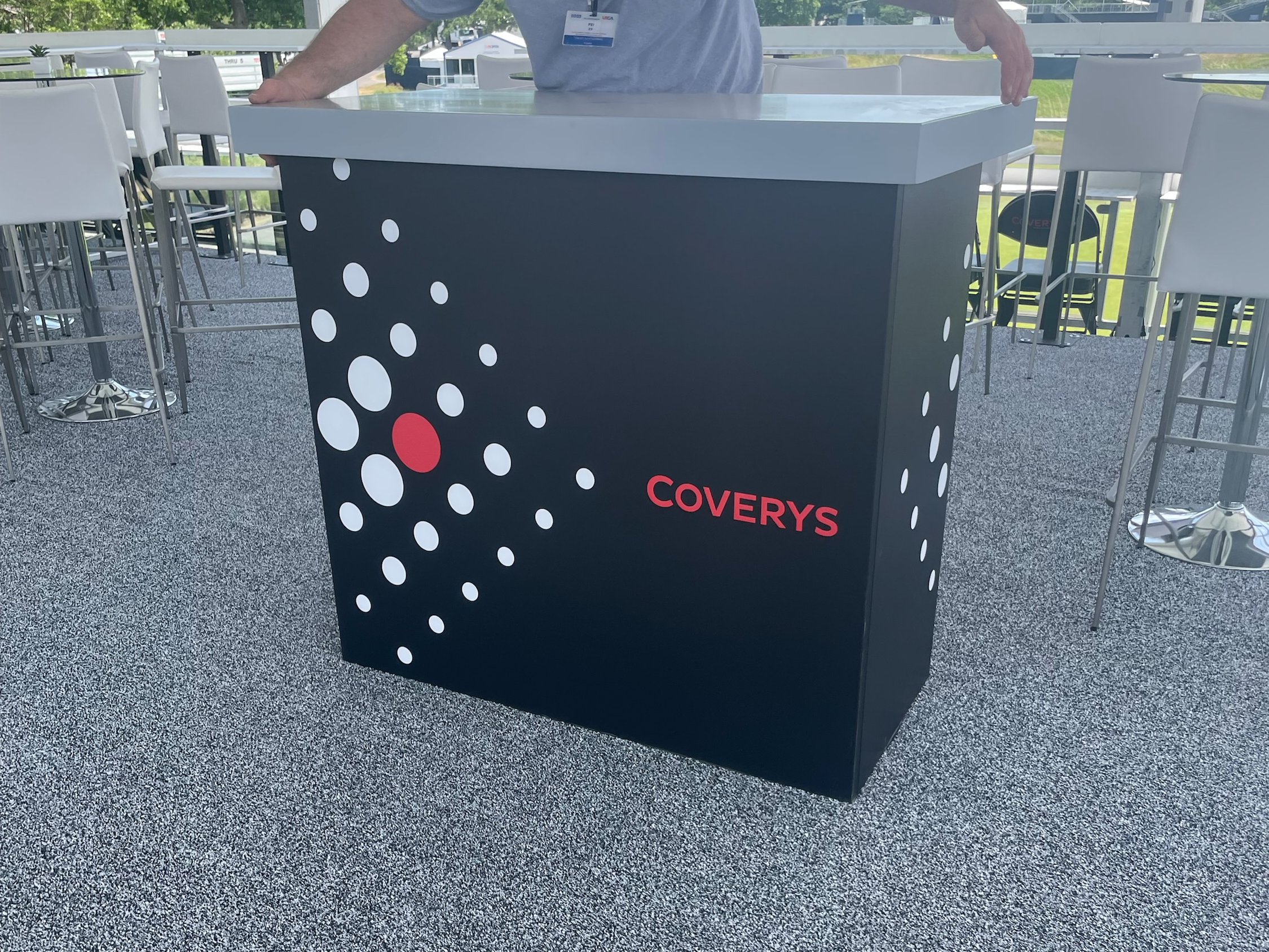 The slideshow above shows Coverys’ semi-private suite at the U.S. Open Golf Championship. I designed the wrap on the check-in desk (slide 1), decals on the drink rails (slides 2, 3, 4), decals on the high-top tables (slide 5); I also made the decision of what to include on the chair decals, if anything (slide 2). My intent for the suite was to make a clearly branded design that was light and airy for a hot summer day, as the event took place in June. I also wanted to make sure that the design was not overdone and abrasive; guests did not want to see the Coverys logo everywhere there was space to put it. I played with a look where all the pieces tied into one another as a seemingly continuous design. The check-in desk, the only fully black design, acted as the centerpiece as a means to draw the guests in and deliver an impactful first impression.