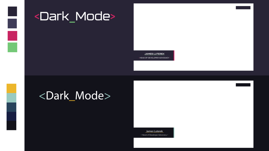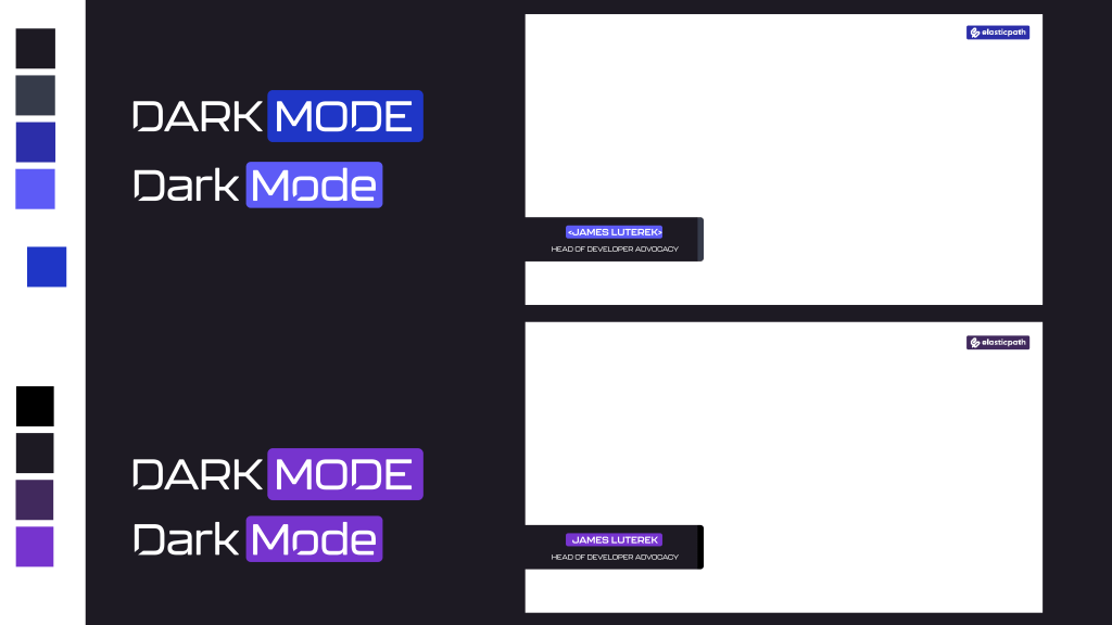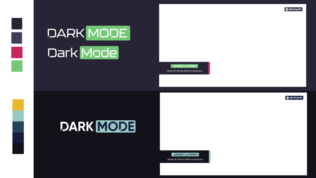 Dark Mode is a YouTube series presented by Elastic Path that focuses on technical demos and programming tutorials. I created the original branding for this series, including the color scheme, logo, and animated logo. The name of the brand, Dark Mode, refers to the color scheme many programmers use for their development environments. The process for creating the branding involved creating a moodboard based on modern high-tech aesthetics, iterating through color and font options that both fit the moodboard and work with the existing company logo and colors, and creating a logo based on those selections.