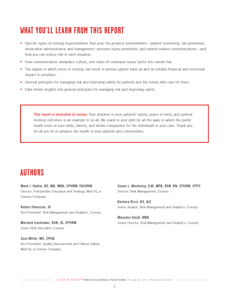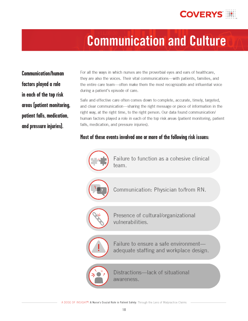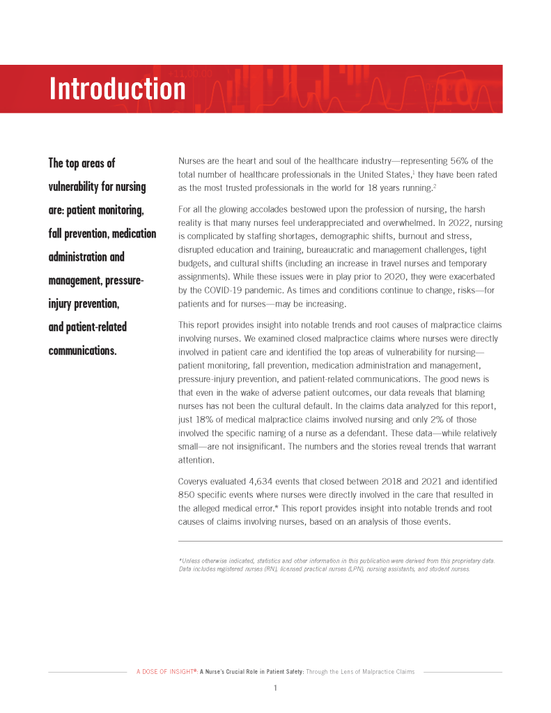 “A Nurse’s Crucial Role in Patient Safety: Through the Lens of Malpractice Claims” is the 2022 edition of Coverys’ A Dose of Insight®. It is an approximately 25 page document exploring a particular malpractice claim issue using data and case studies. My role was to design the layout of the entire document and to create an interactive PDF version containing links, videos, animated GIFs, and more. The slideshow contains a selection of 9 pages from the print version of the report. You can see the interactive report here.