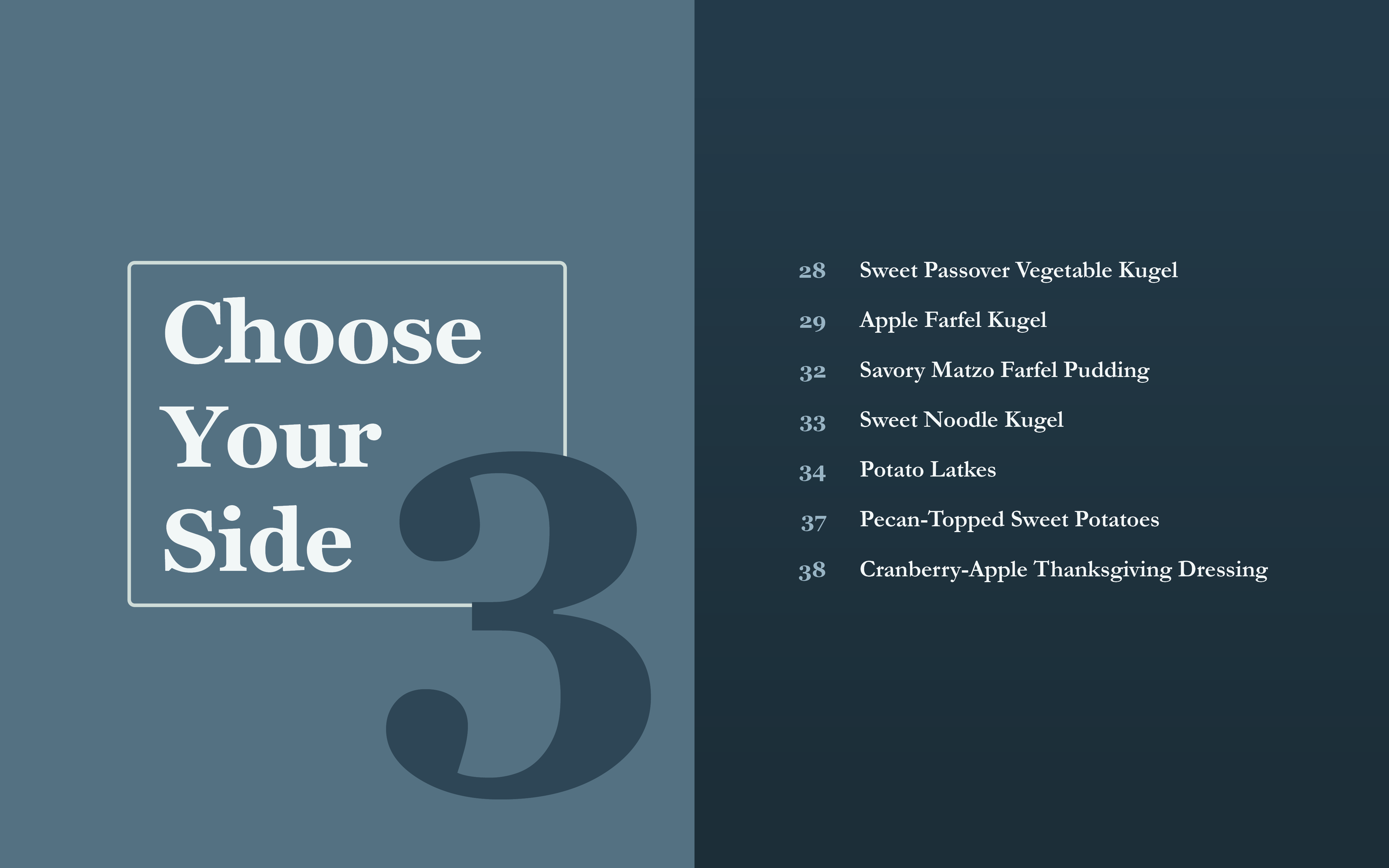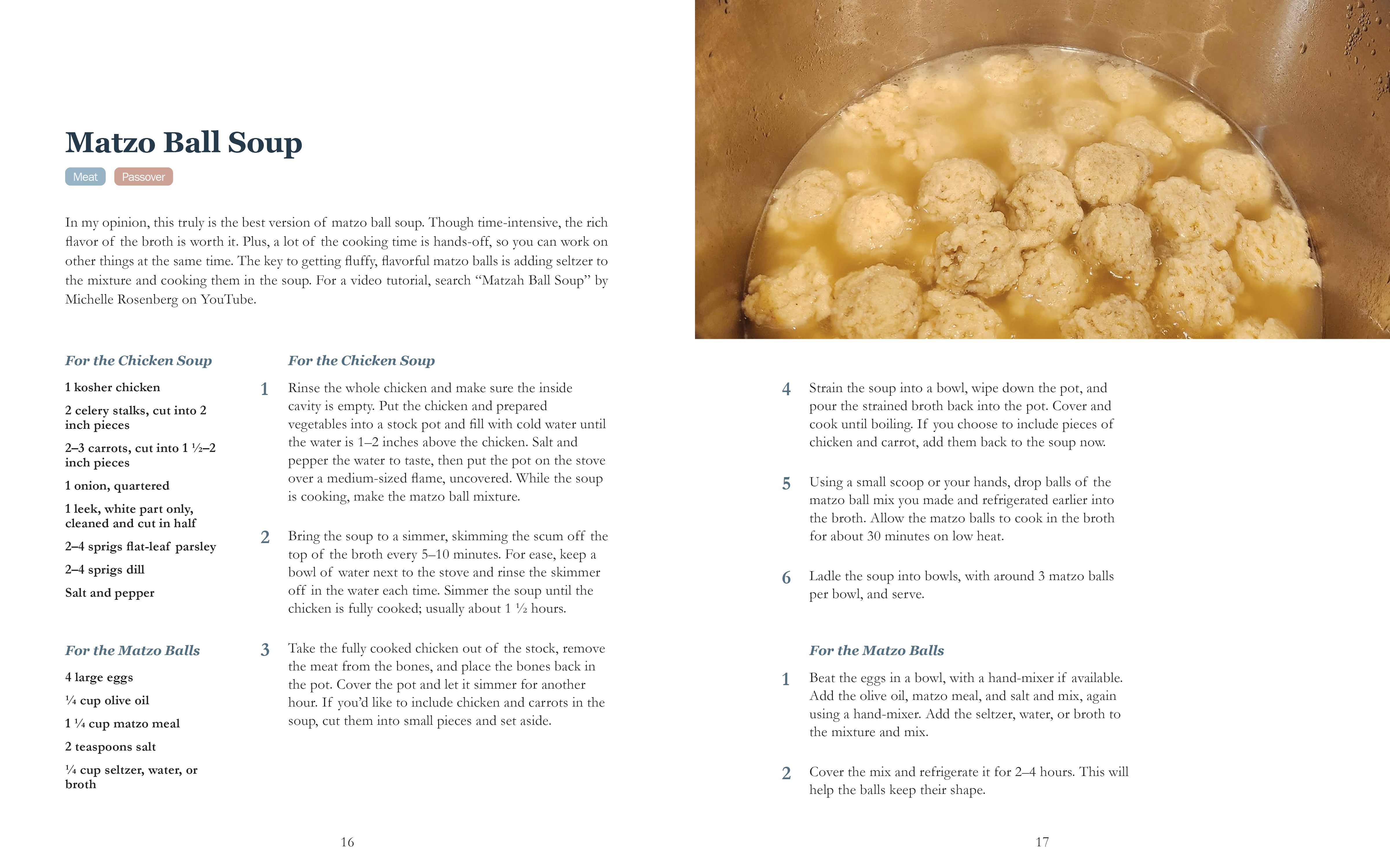 A Jewish Mother’s Holiday Helper is a 76-page cookbook containing a compilation of family favorite dishes often served during various Jewish holidays, such as matzo ball soup and hamantaschen. I created the entire cookbook; I selected and compiled recipes from various sources, edited recipes to follow a consistent format and wrote descriptions for each, found images for every recipe, edited and color-corrected all images, designed the layout of the various spreads, designed the front and back covers, and set up the files to be printed.