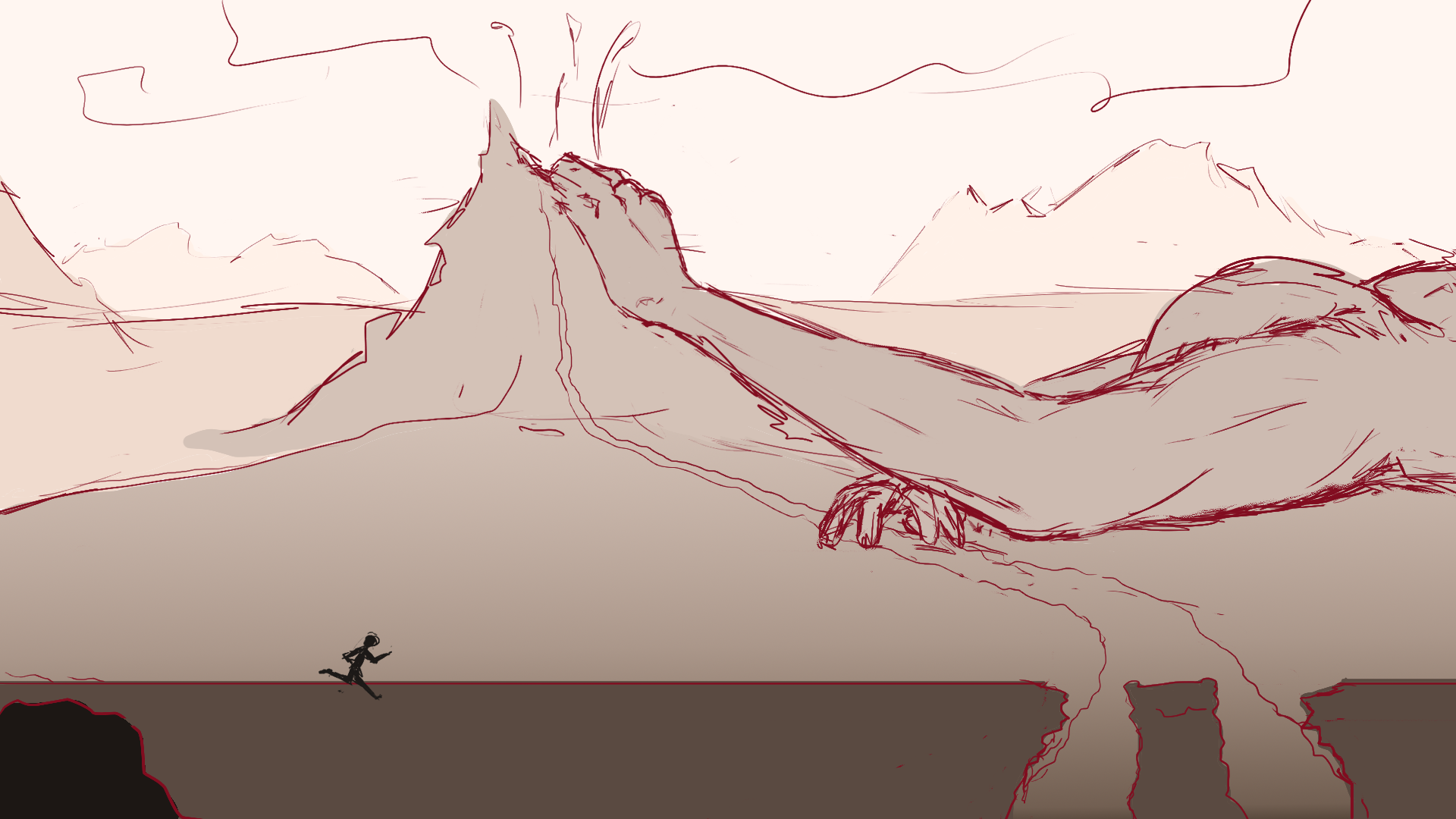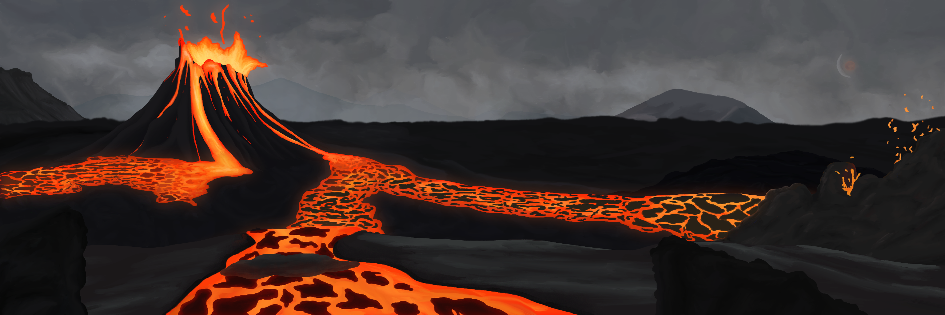 The ashen land of the erupting volcano is the first of two environments created for a simple 2D side-scroller game I created in Unity for Virtual Environment Design. You can see the second environment here. The story of the world as a whole is that there were 10 gods who created the world the main character lives in, with each one controlling a particular domain. However, someone or something has been killing these gods, plunging their respective domains into chaos. In this scene, the environment is a baren, volcanic wasteland that has been turned into a red-hot, active volcano and pools of flowing lava by the (implied) death of its god. In the initial sketch, shown below, I had placed the corpse of the god in the composition, but I decided not to include it in the final version as it made the composition unbalanced.