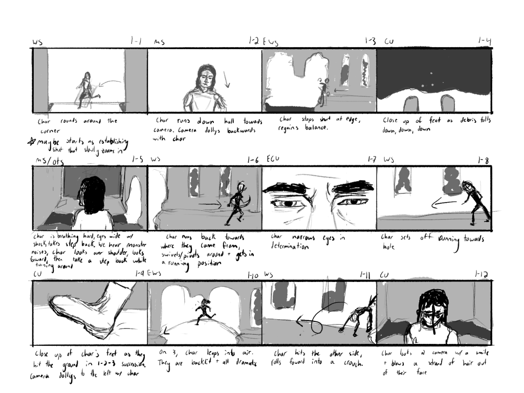 “Flight of the Assassin” is a 3D animation created as a semester-long project for Animation 1. The goals of the project were twofold; the first part of the assignment, and the part we spent the most time on, was to design and create an indoor environment. This built up skills in hard surface modeling and lighting in Autodesk Maya and introduced texturing in Substance 3D Painter. To see more about the environment, click here. The second part was to design and create a character and animate them in the environment we created. This introduced soft surface modeling in Maya, and improved skills and techniques for character rigging, lighting, and controlling cameras.