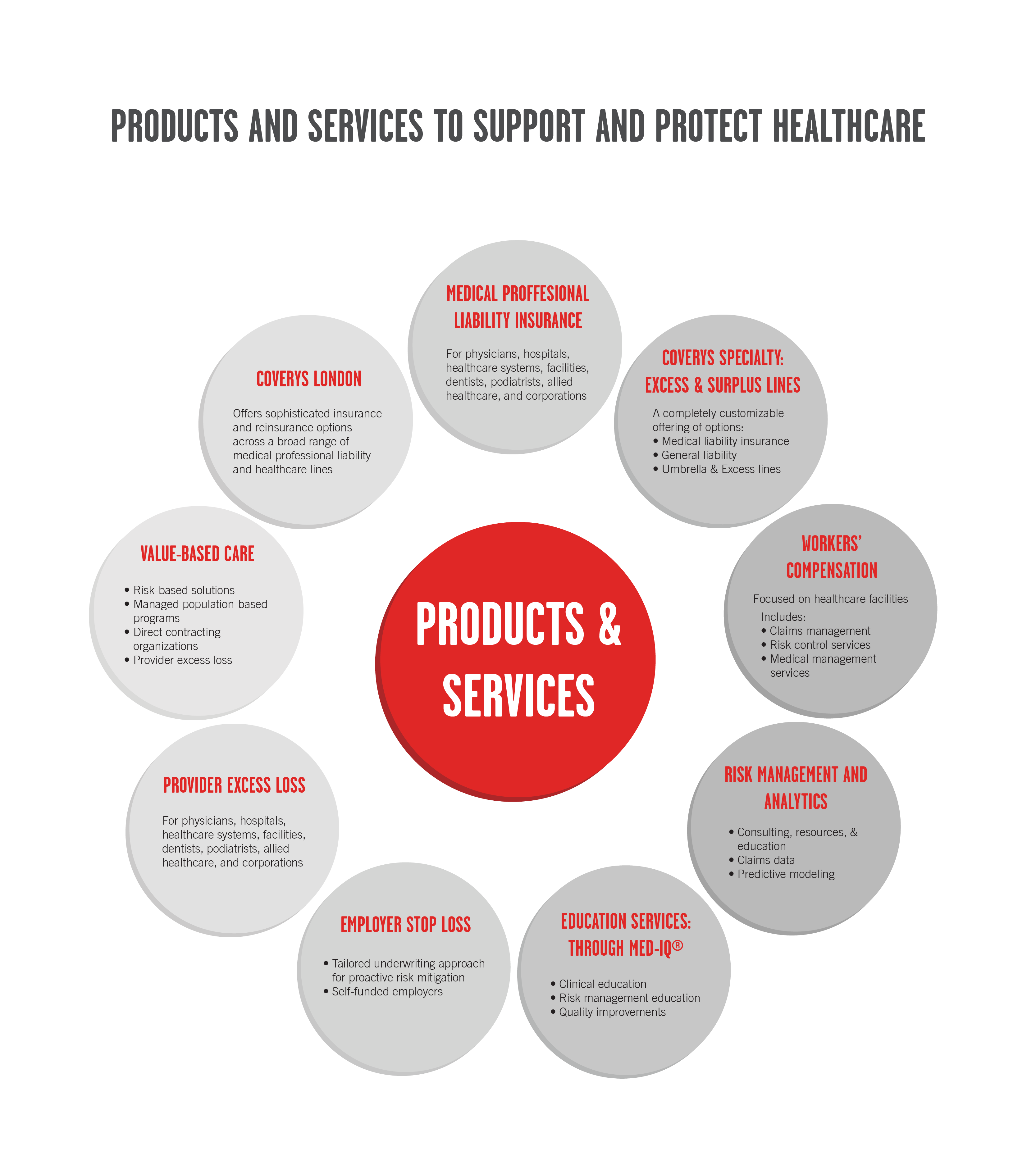 This graphic was created for a brochure given to any agent or broker interested in selling Coverys insurance products or any client interested in buying Coverys insurance products. The purpose of the Products and Services graphic is the depict all the varying products and services offered by Coverys, sorted by the different categories they fall into.