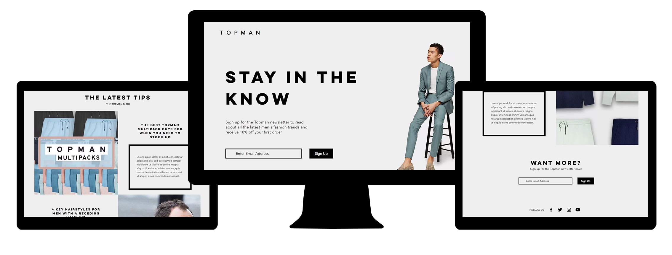 The design of a mock landing page for the British clothing brand Topman. The webpage was designed in Wix as practice creating landing pages that encourage transactions. In this page, the goal is to get users to sign up for Topman’s newsletter. This page is not in association with the brand Topman, and was for educational purposes.