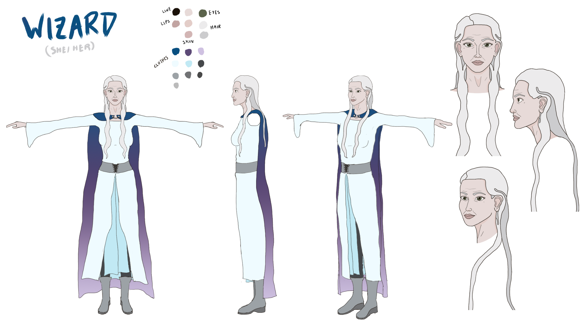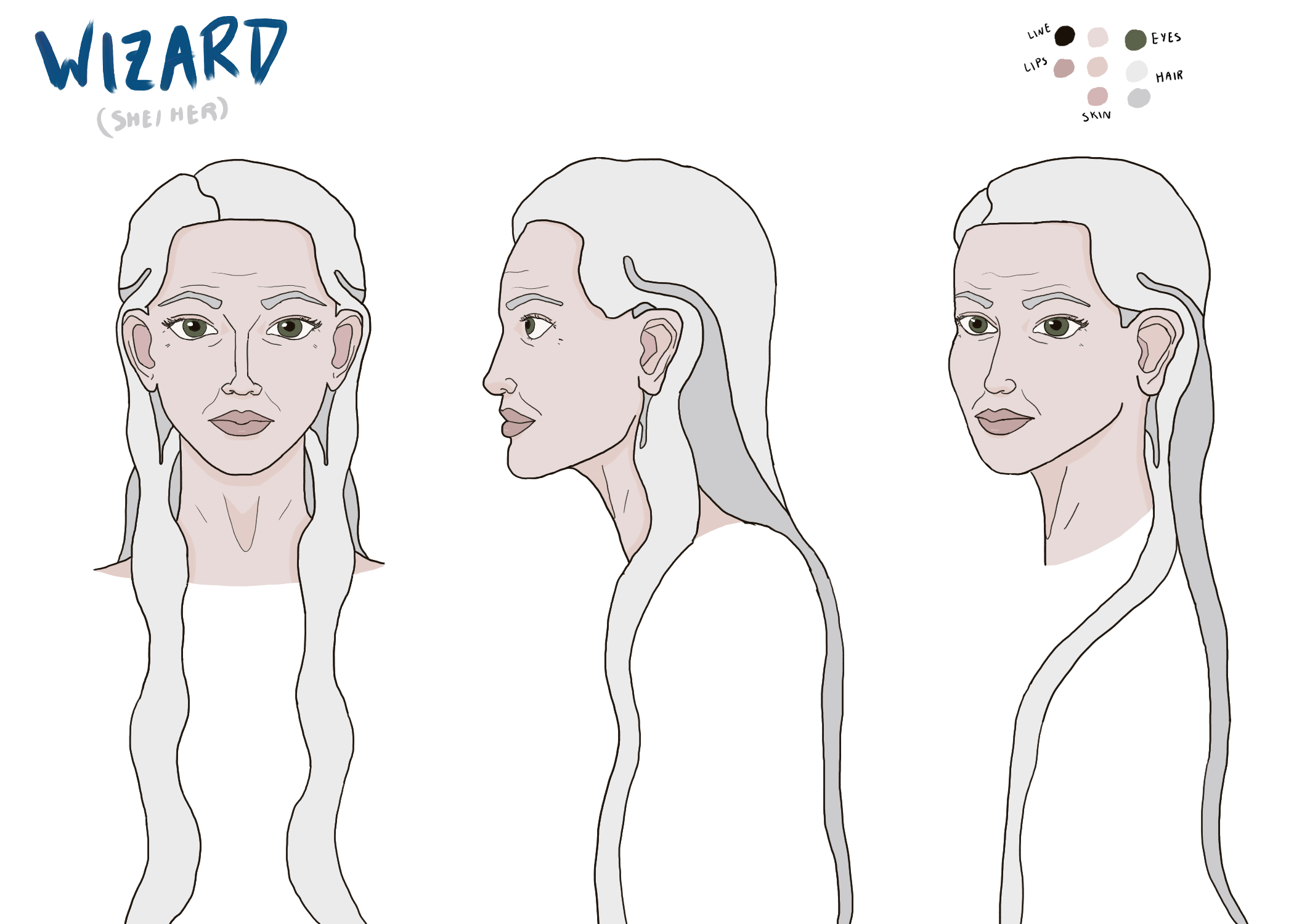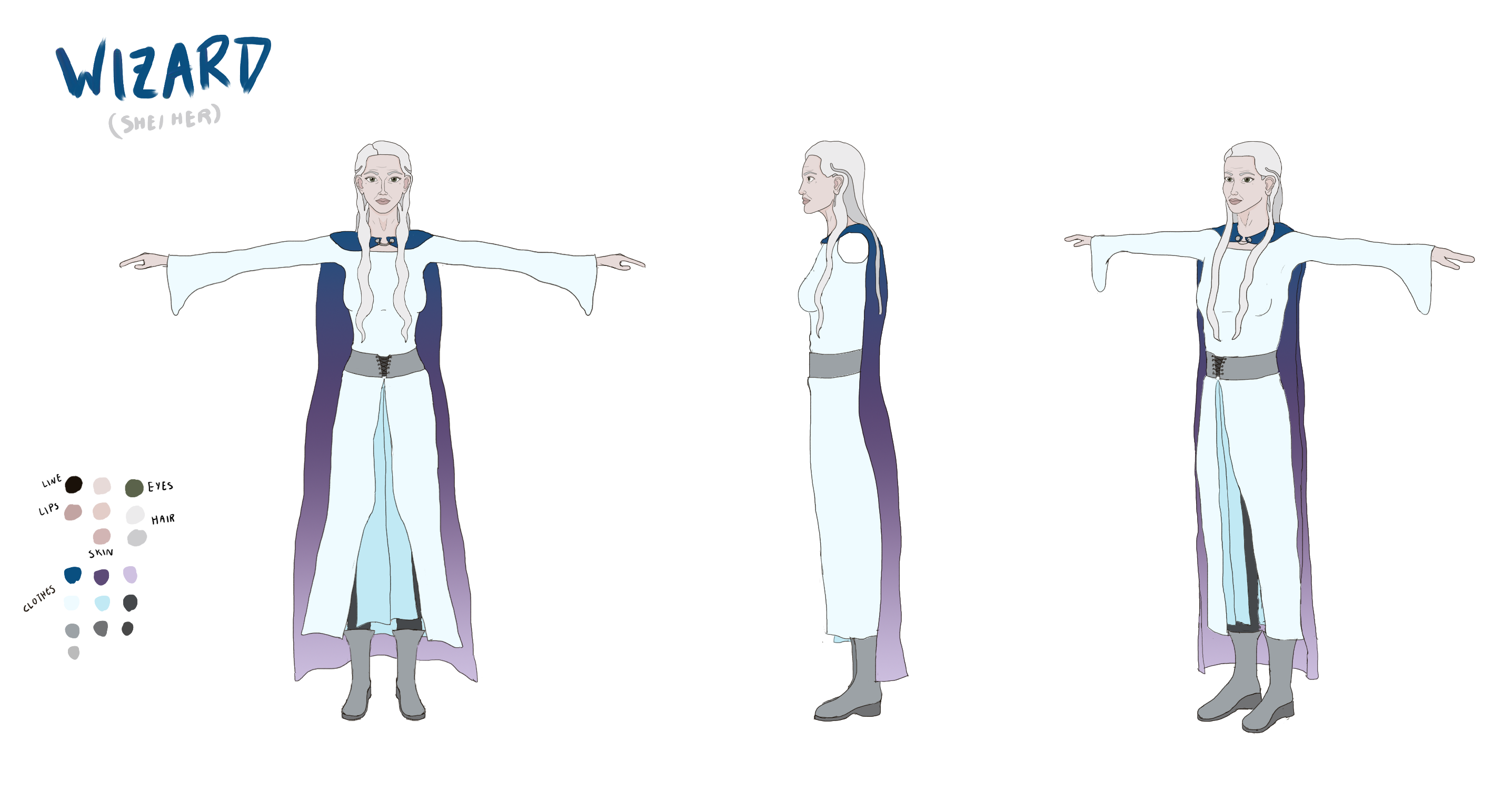 The Wizard is one of four unique characters I created in Character Design. The idea was to create four characters that somehow interact with each other within a world, design the look and general personality of each character, make character sheets for each, and then make a composition at the end of all four characters interacting. You can also see the Assassin, Healer, and Fighter. The setting is medieval fantasy, so the Wizard wears a dress and cloak that give her a classic wizard-like silhouette. Her general story is that the Wizard does magical odd-jobs for money while mentoring and helping the other three characters. She is very intelligent and calculating, yet at the same time warm and maternal, treating her mentees like her children.